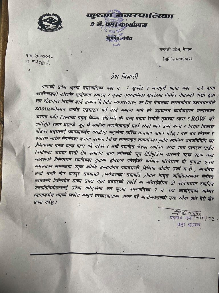 वडाध्यक्ष यादुनाथ बास्तोलाद्धारा जारी गरिएको विज्ञप्तीमा आयोजनाको काम निमार्णलाई सहजता प्रदान गर्दै जिल्ला प्रसासन समक्ष भूमिका निर्वाह गर्दै काम गर्ने शिलशिलामा वडाले खेलेको भूमिका समेत सार्वजनिक नभएको भन्दै दुख ब्यक्त गरेका छन् । ९७ प्रतिशत मात्रै काम सम्पन्न गर्दै कालीगण्डकी करिडोर प्रसारण लाइन पर्वत सब–स्टेसनको उद्घाटन गरिएको भन्दै वडाले यसको खण्डन समेत गरेको हो । भौतिक पूर्वाधार पुरा नहुदै हतारमा गरिएको उद्घाटनले आम जनताको आँखामा छारो हालिएको समेत विज्ञप्तिमा भिनिएको छ ।
