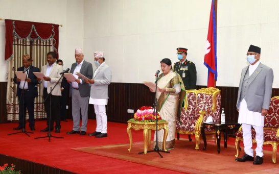 नवनियक्त मन्त्रीहरु ऊर्जा, जलस्रोत तथा सिँचाइमन्त्री टोपबहादर रायमाझी, उद्योग, वाणिज्य तथा आपूर्तिमन्त्री लेखराज भट्ट, शहरी विकासमन्त्री प्रभु शाह र श्रम, रोजगार तथा सामाजिक सुरक्षामन्त्री गौरीशङ्कर चौधरीले राष्ट्रपति भवन शीतलनिवासमा आयोजित समारोहमा शपथ लिएका हुन् ।